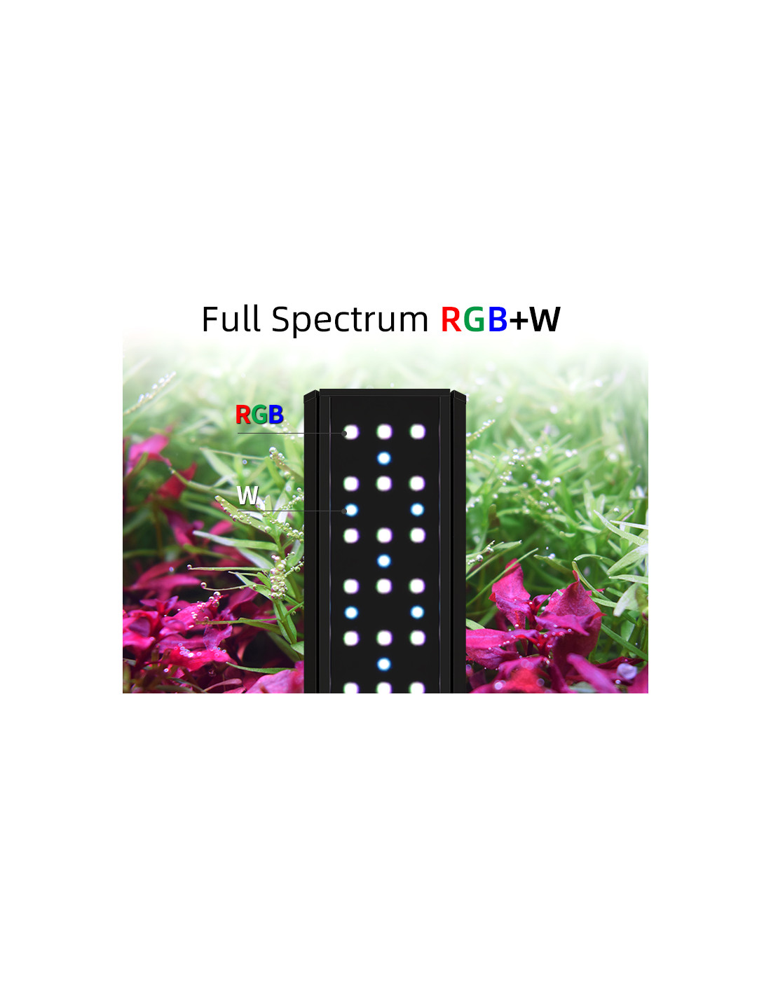 Iluminação WRGB com controlador incluĆdo para ajuste de horas, intensidade e efeito amanhecer/anoitecer. Ideal para aquĆ”rios plantados.